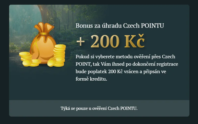 | Bankovní převod | Převod z osobního bankovního účtu na účet kasina | 1–3 pracovní dny | 200 CZK | 500 000 CZK |